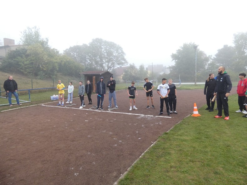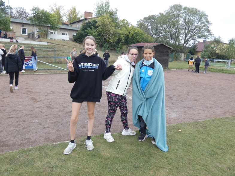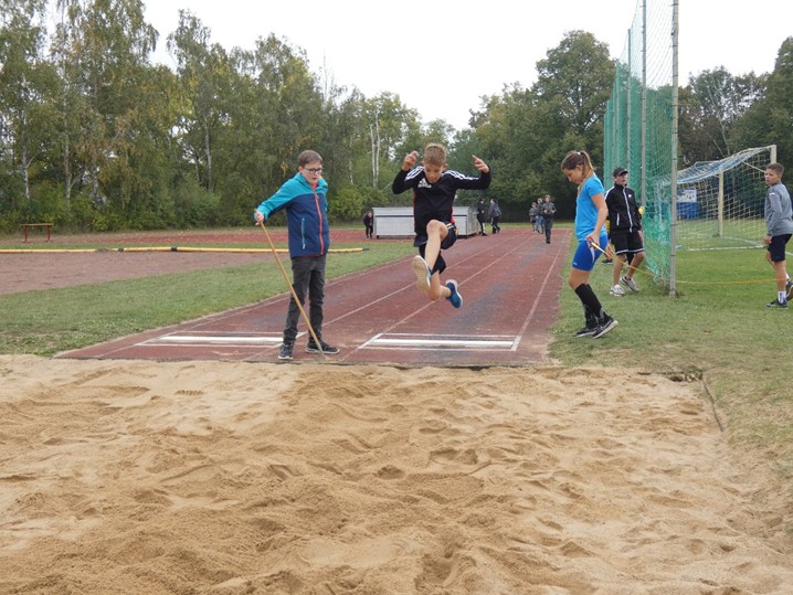 Den Auftakt machten am frühen Morgen aber zunächst einmal die Teamstaffeln, wobei jede Klasse jeweils 8 Athleten (mind. 2 Mädchen) an den Start bringen musste, um möglichst schnell die 8x100m zu absolvieren. Siegreich gingen dabei die 8b, gefolgt von 9a und 7a (Klassenstufe 7-9) sowie die 6b in der Klassenstufe 5-6 hervor, die die 5a und 5b auf die Plätze verwies. Im anschließenden Dreikampf gaben viele ihr Bestes und erzielten teils hervorragende Ergebnisse. Hervorzuheben sind hier vor allem Anna Löser (7b) mit 7,5s über 50m und 4,76m im Weitsprung, Jamie Losse (6b) mit 7,7s im 50m-Sprint und 4,12m im Weitsprung sowie Lenny Seifert (8b) mit 9,8s über 75m sowie seine im Sportunterricht erreichten 2:47min über 800m. Sie wurden dafür zusammen mit Lori Zander, Luna Tomzak, Dennis Schätze, Max Latz und Fritjof Riehme mit der Ehrenurkunde geehrt. Außerdem erreichten 48 Schülerinnen und Schüler die nötigen Punkte für die Siegerurkunde, während 105 Athletinnen und Athleten mit der Teilnehmerurkunde geehrt wurden. Aktivste Klasse wurde die 5b (95% aller Schülerinnen und Schüler nahmen teil), die auch das Zweifelderball-Turnier gewann, gefolgt von 5a (90,5%), 6b und 7b (jeweils 90%). Schlusslicht war die 8a mit nur 54%, die aber mit der „kreativsten“ Staffel nachhaltig für Eindruck sorgte 😉.