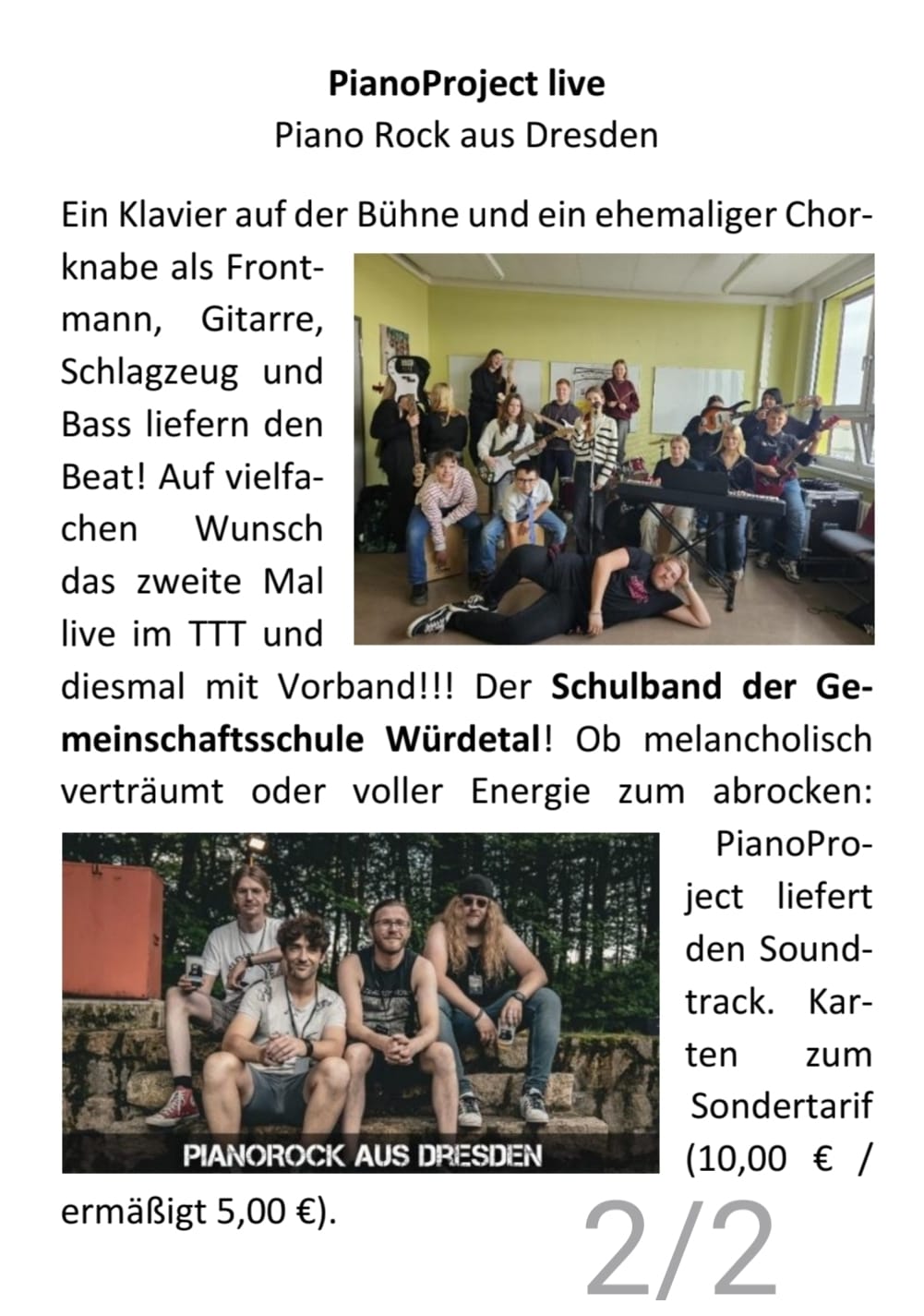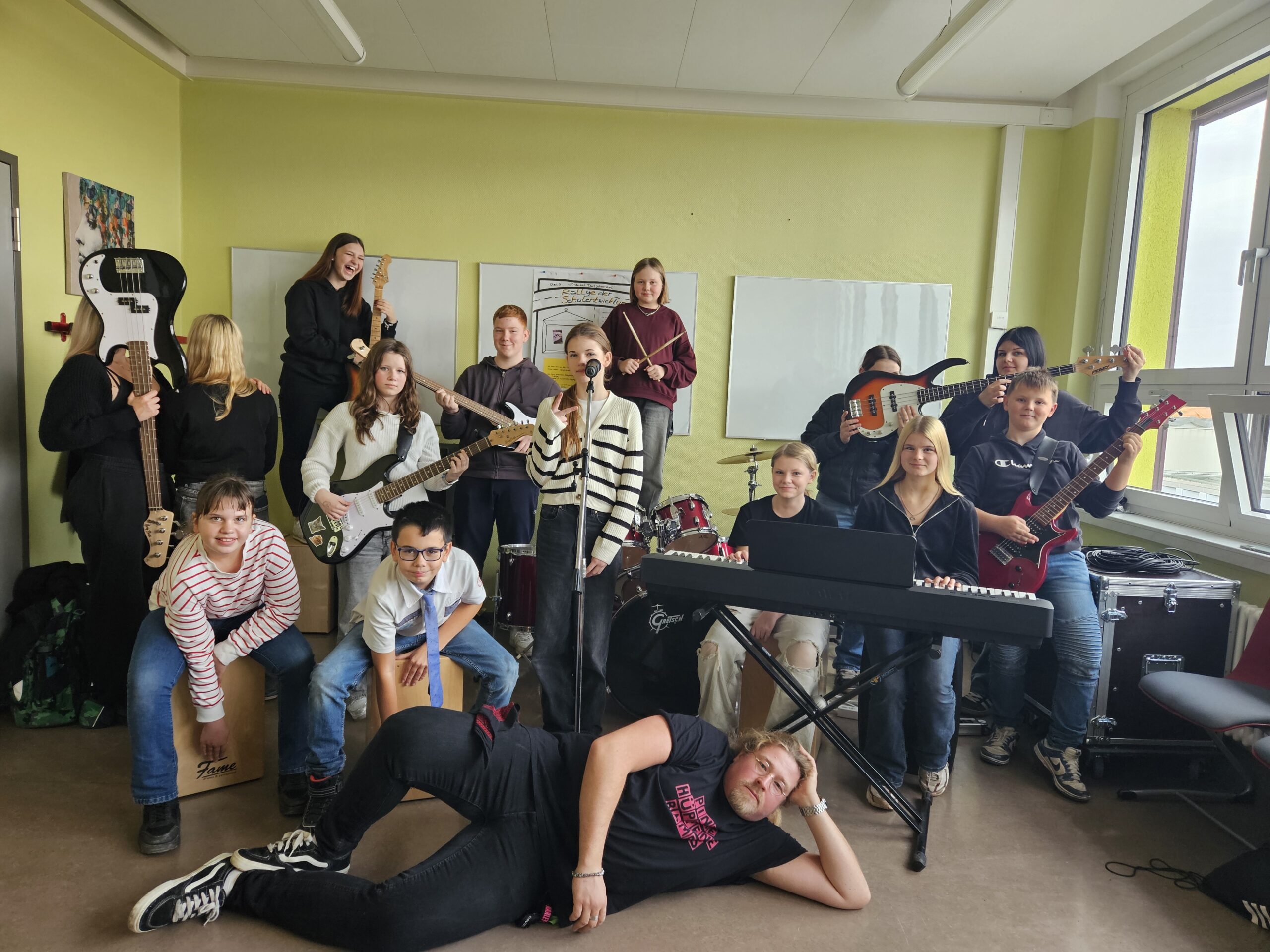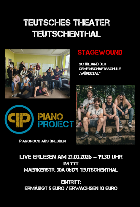 … die Schulband der Gemeinschaftsschule „Würdetal“ in Teutschenthal. Im Schuljahr 2024/25 haben wir uns im Rahmen des Ganztagsangebots gegründet, proben einmal in der Woche für 90min und haben bereits zum Abschluss des Schulweihnachtsmarktes 2024 eine öffentliche Probe gespielt und zum Schuljahresabschluss auf der Treppe vom Haupteingang vor der gesamten Schule gezeigt, was wir erarbeitet haben. Im neuen Schuljahr haben wir viele neue Schüler von Klasse 5 bis 10 dazu gewonnen und haben auch zum vergangenen Schulweihnachtsmarkt sowie zum Schnuppertag zeigen dürfen, was wir so drauf haben. Am 21.03.2026 werden wir im Teutschen Theater Teutschenthal als Vorband für PianoProject aus Dresden mit 2 Songs auftreten.
